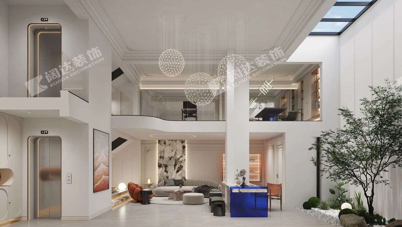 隔層區(qū)域是健身區(qū)和主人書房區(qū)域,為了在視覺上放大空間,將健身區(qū)的鏡子延伸穿插到書房里面,用氛圍燈進行鏈接,看似單獨的兩個空間,卻又有著緊密的聯(lián)系。