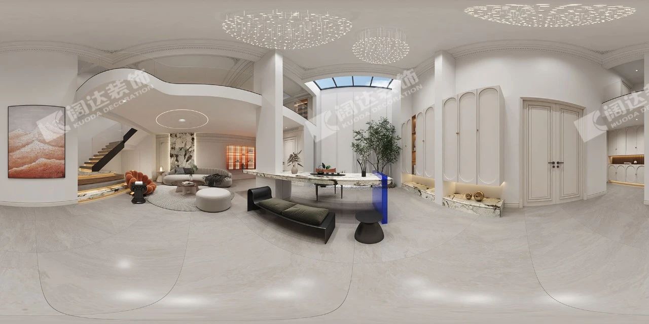 天花上在客廳延續(xù)設計的同時,加入GRG水波紋定制板,讓天花更具靈動性,弧形元素也與隔層、電梯門、沙發(fā)及衛(wèi)生間的采光窗相呼應。