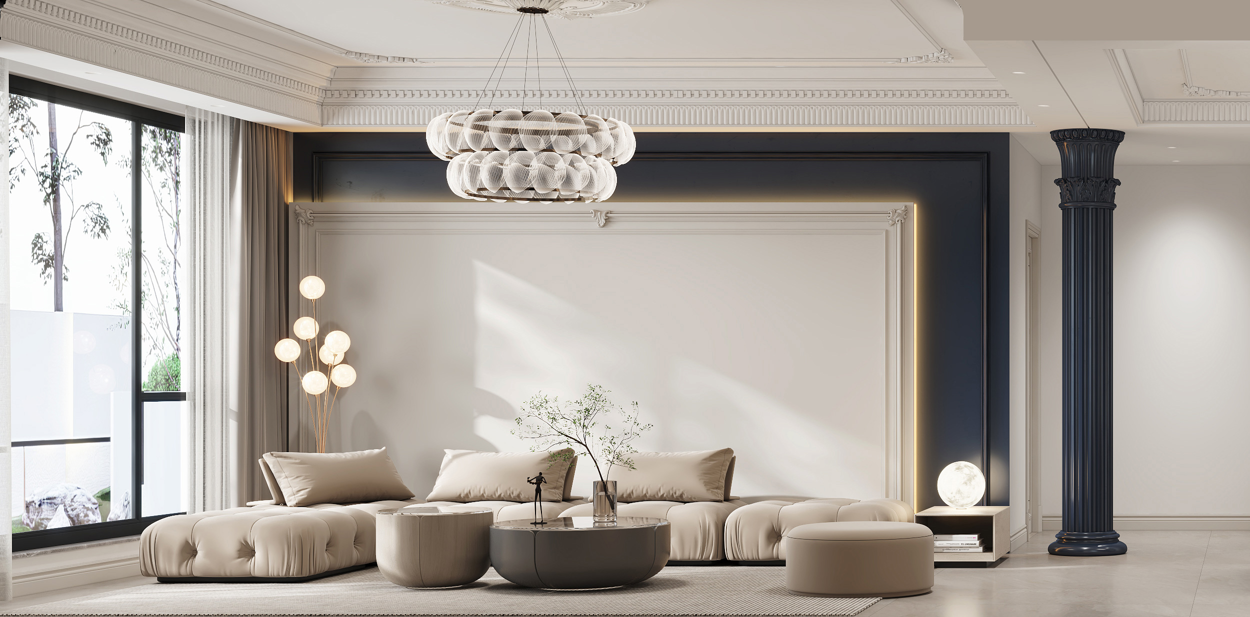 奶白色讓視覺空間更有延伸感,讓法式風設計感加倍,天花板邊角精致的雕花和花紋,增添了空間的精致度,提升了房間的整體顏值與質感。法式家居在色彩上較為質樸與素凈,偏向于明亮的色系,以簡單的設計,來涵蓋所有功能和空間,線條感奠定了法式風的基調,用多種燈光的配比渲染光影,使得整個空間更加簡潔干凈。