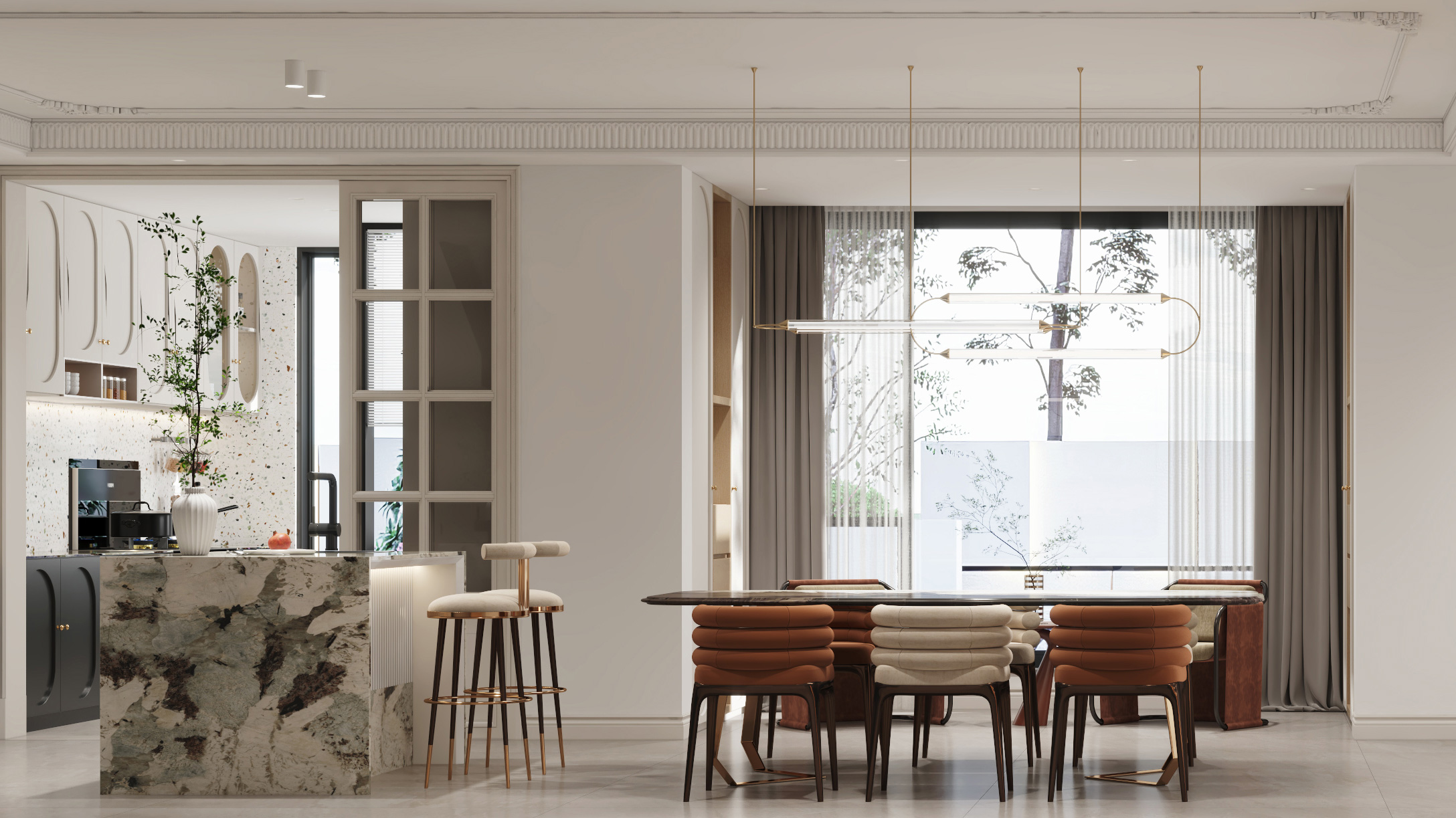 在延續(xù)了客餐廳整體基調外,會客區(qū)主背景別具一格的潘多拉石材與法式線條相結合,加上右邊漸變亞克力裝飾柜的跳躍,讓整個背景在保證法式浪漫主義的同時,凸顯年輕的活力與色彩。