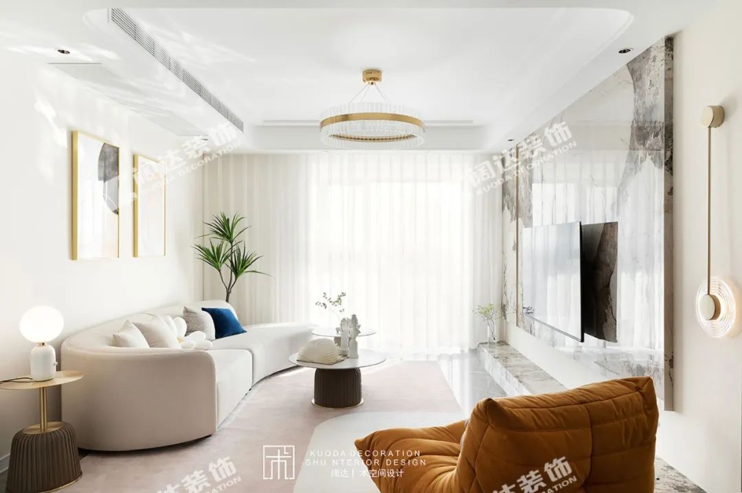 本案中的146平米的三居室整體采用了現代風格裝修,背景墻板與門型采用米白材質,與電視墻外側黑色背景,電視柜桌子、茶幾,形成鮮明對比,輔之灰色點綴,讓整個空間充滿典雅大氣,又不失現代時尚感。燈光多以暖色,給人以溫馨懷抱的暖感,加之白色調相輔相成,營造溫馨的同時又偏于現代生活的明朗。