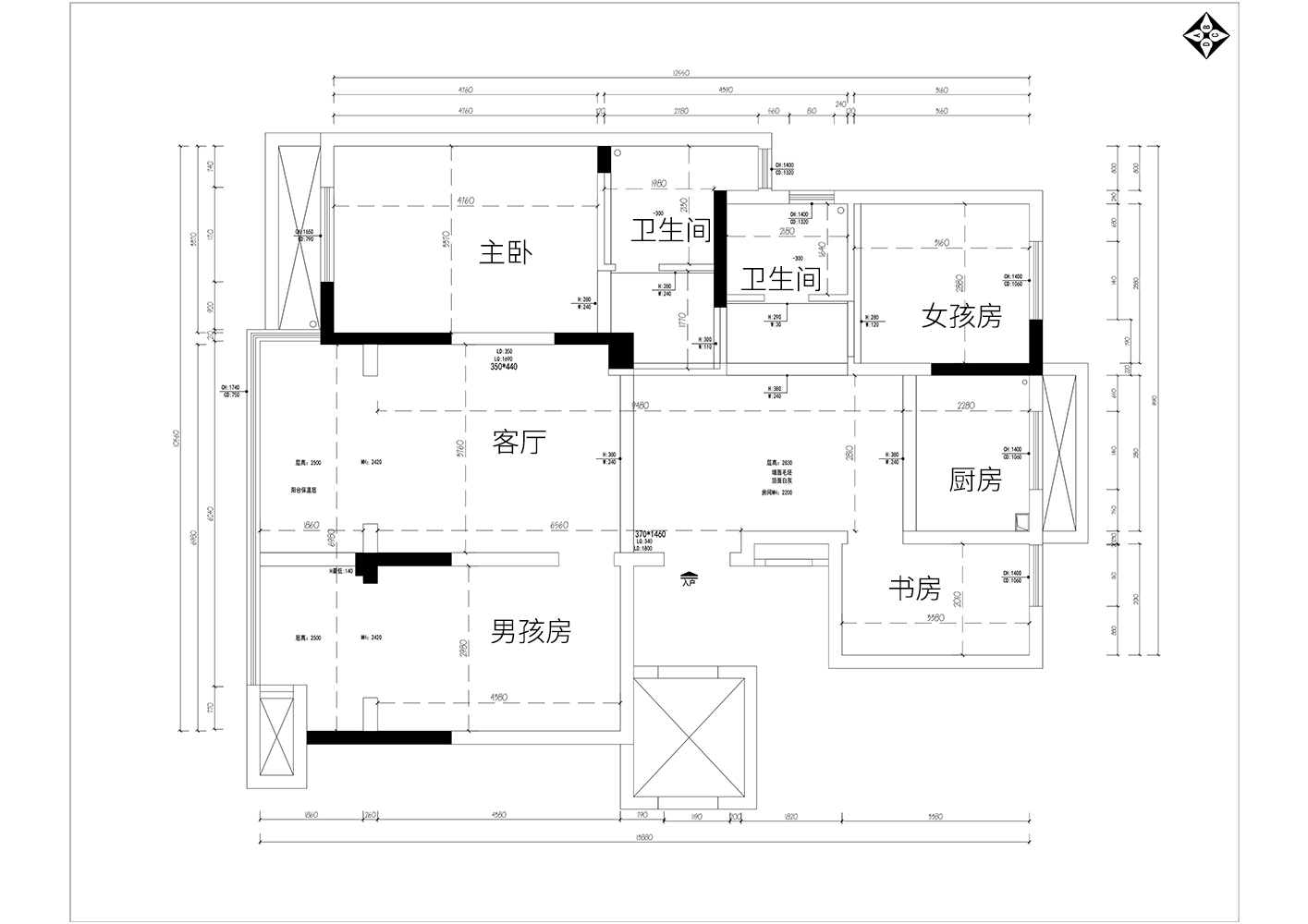 1、將兩個衛生間重新分配,改成三個獨立的功能區,滿足了一家四口淋浴、坐便、洗漱的正常使用