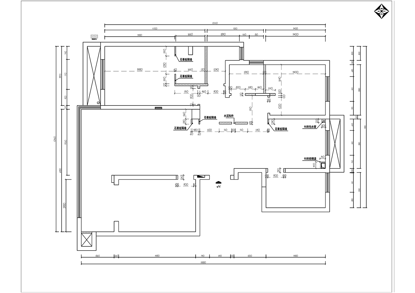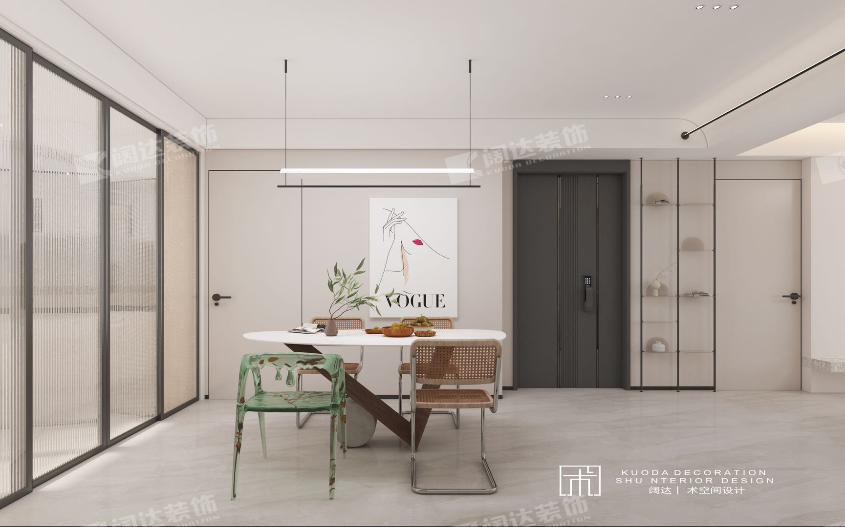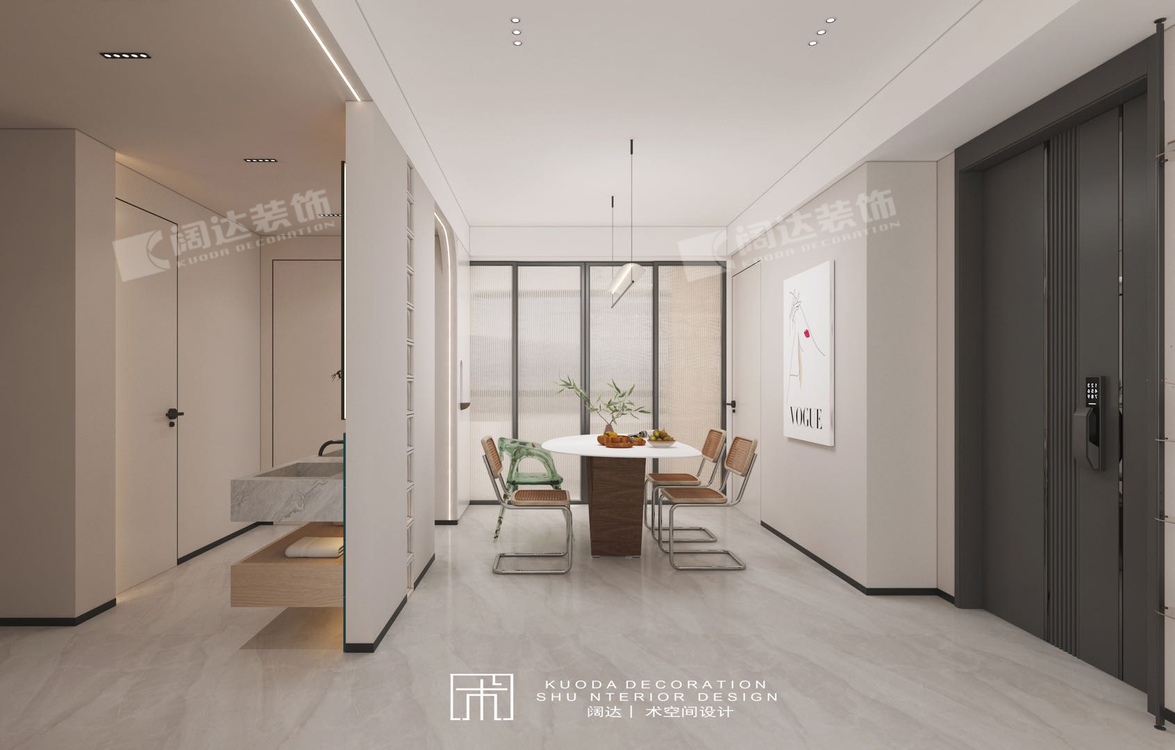 2、拆除廚房門墻,用推拉門將廚房與用餐區隔斷,增加了餐廚區空間延展性;衛生間重新分配后,洗漱區隔斷恰好解決了用餐區正對衛生間門的情況