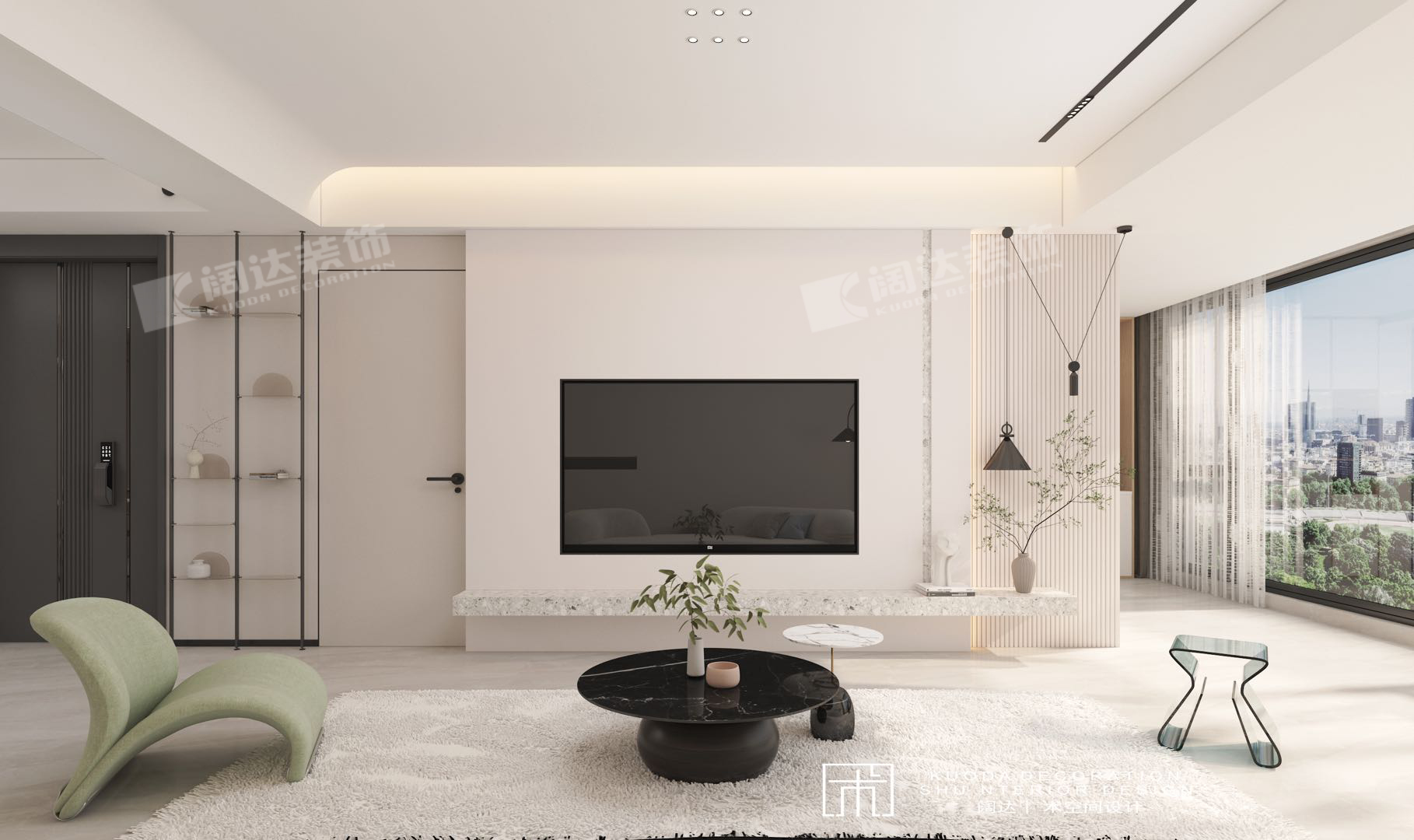 整體空間舍棄了大理石,木飾面,硬包等貴重材質,以石膏板和特殊新型材料做一些簡單的設計造型,用軟膜線性燈、天際燈、軌道燈、垂線進行搭配,滿足每個空間對燈光的需求。