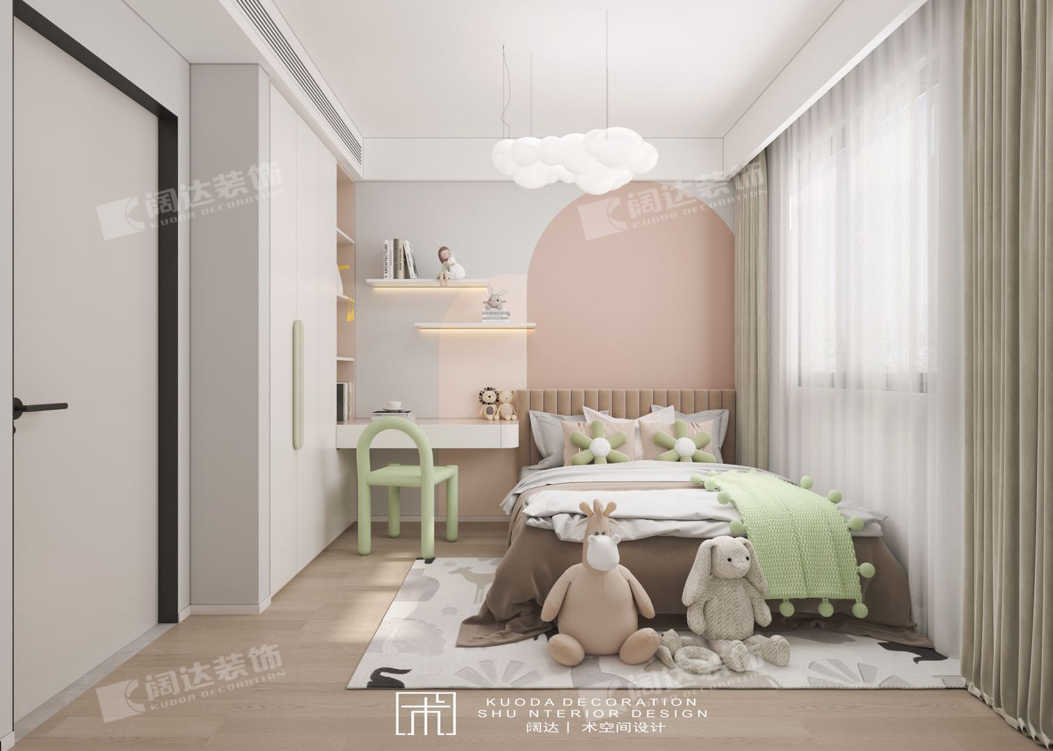 奶油暖色調,搭配綠色家族——透明亞克力的綠色椅子,牛油果綠色的單人沙發,小清新綠的kaws公仔,衛生間干區復古墨綠色的瓷磚,給人暖暖的、奶呼呼的感覺。簡單舒適,適合居住,心之歸宿。
