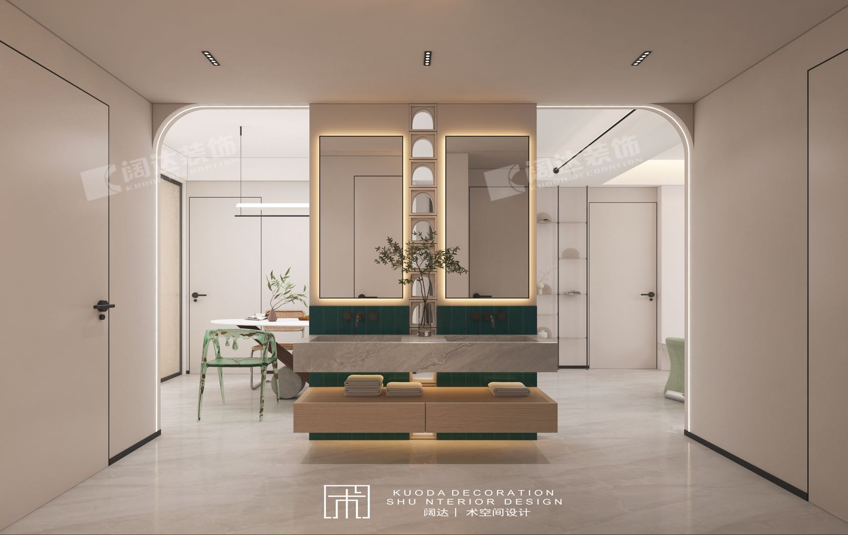 以淡奶油色為基調,大量的圓弧曲線在室內以不同的方式進行呈現,既隔斷了空間,處理了頂上的大梁,又能在造型上展現不一樣的美。搭配簡單的線條畫,給人簡單高級的感覺。